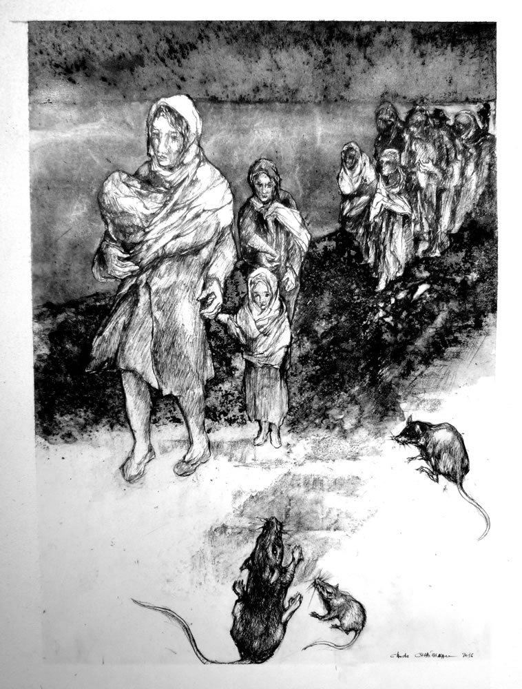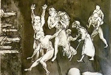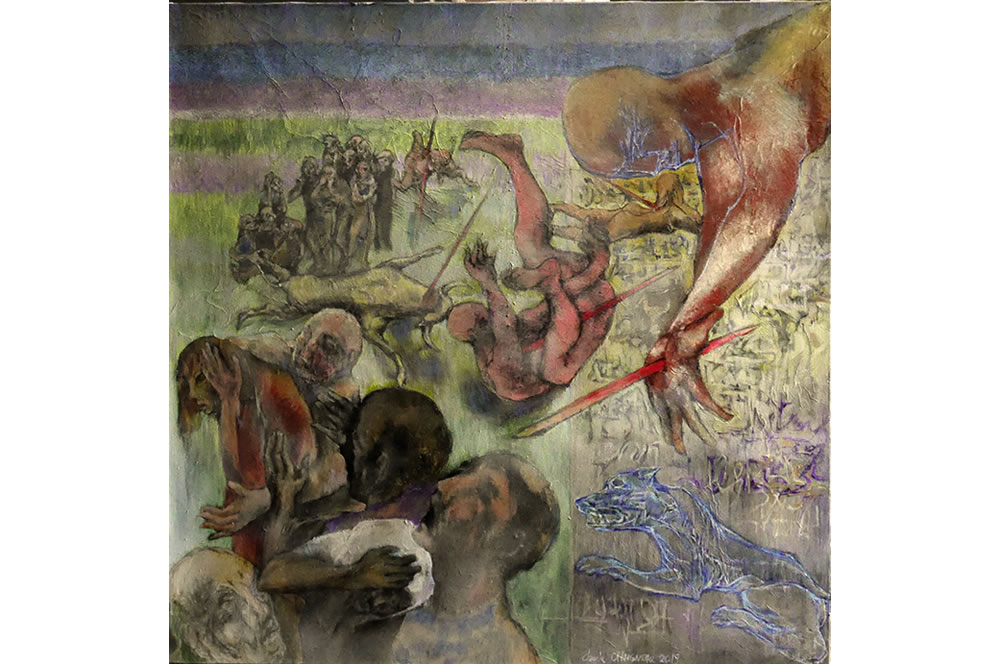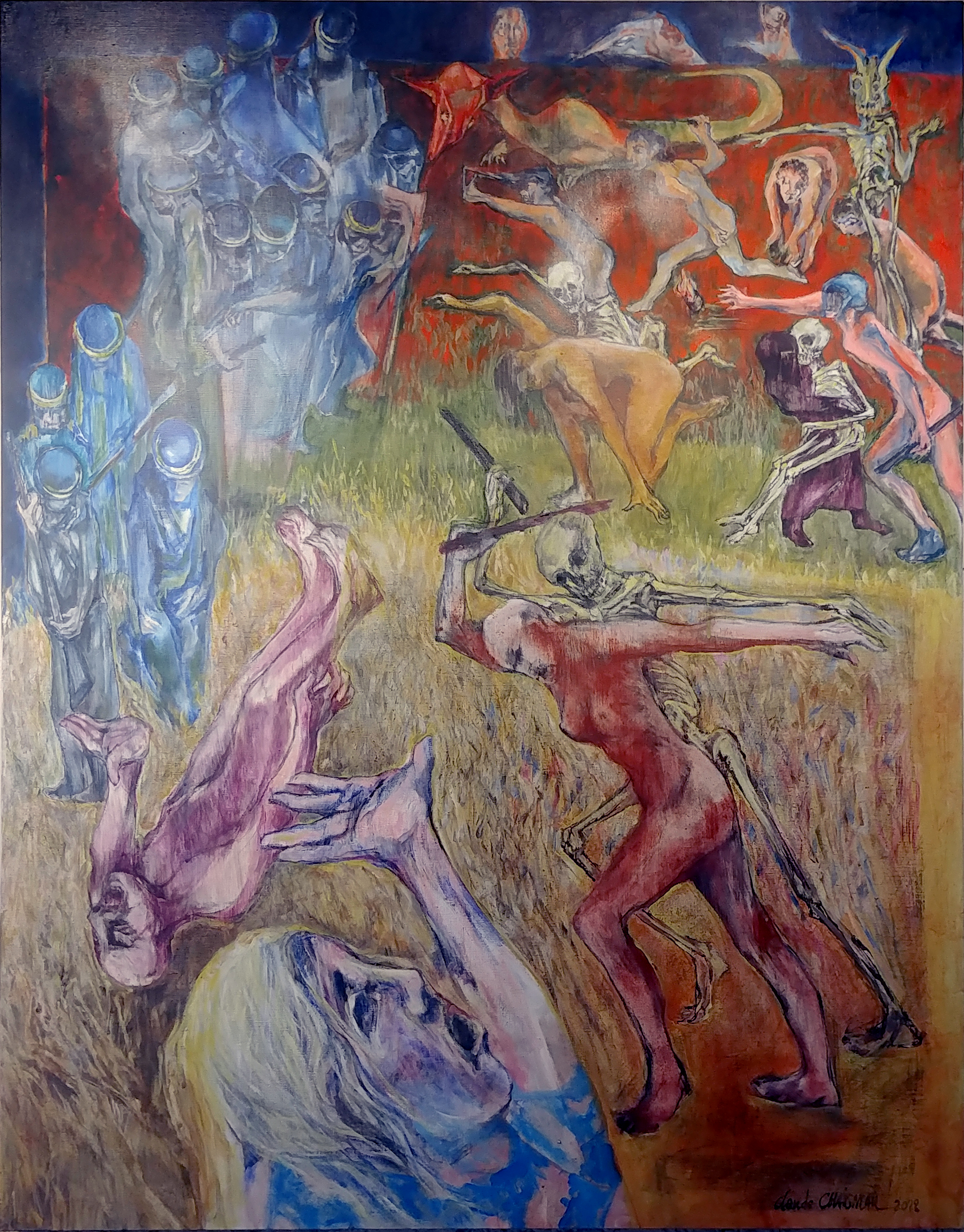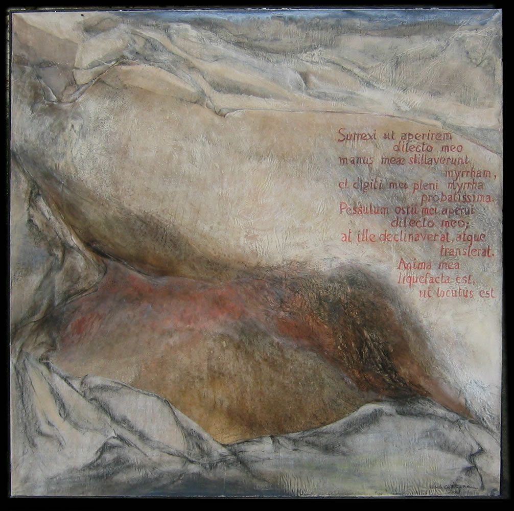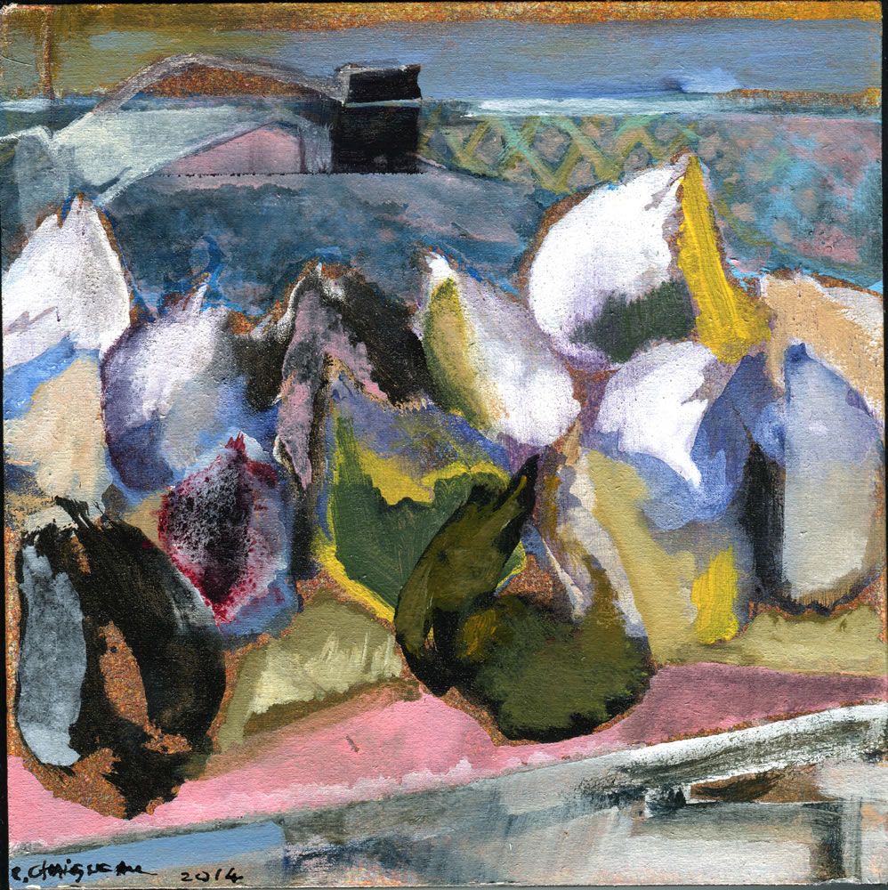 Claude Chaigneau à vécu auprès de limites de terroirs. Deux provinces se touchent en sa demeure : le Quercy et le Rouergue. Il participe des deux et pratique les langues qui s’échangent alentour. C’est dans le hameau de Gratacap qu’il peint, dessine et reprend chaque jour goût à son monde qui s’inscrit dans un paysage où la terre, vallonnée, associe les bosquets aux strates lointaines des causses. Paysage de variantes, d’escarpements et de collines, mais aussi de contrastes, de senteurs terreuses. L’ancienne demeure de pierres vives, solide comme tour de garde, est scindée en deux corps, elle aussi : l’habitacle avec terrasse et l’atelier qui se répartit dans l’ancien pigeonnier ouvert sur le jardin en contrebas. A l’étage de la tour sont entreposées les nombreuses œuvres achevées, dans une partie sombre orientée vers le nord. Puis une ouverture donne sur l’atelier proprement dit, soit le lieu du travail en cours ; il ouvre sur trois côtés, trois échappées possibles vers le jardin et la succession des vallons. C’est là que s’élabore ce qu’il reste à faire, à peindre, à dessiner, à inventer. Chaque matin le peintre regagnait le chemin du dialogue avec lui-même, ses sources vitales, sa fougue, ses désirs de peindre. Yves Bonnefoy a raison de dire que « l’art est ce qui cherche à maintenir vive l’expérience directe de la présence vive de ce qui est. Il est la guérison du concept ». [ Extrait DESSINS, PEINTURES ET OBJETS DE BIBLIOTHEQUE - Michèle-Baj Strobel - ]